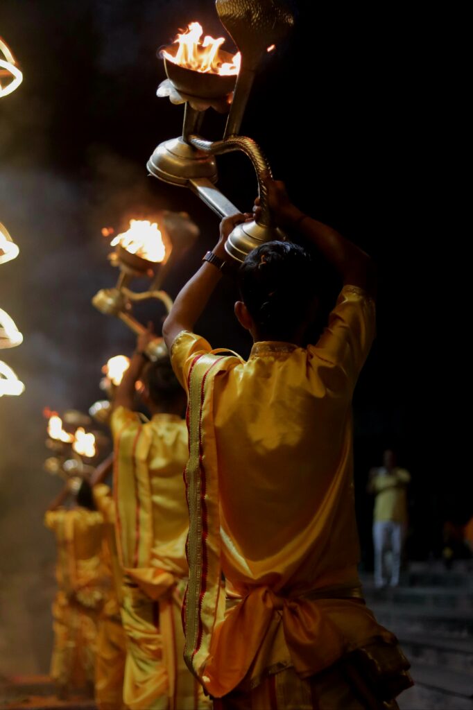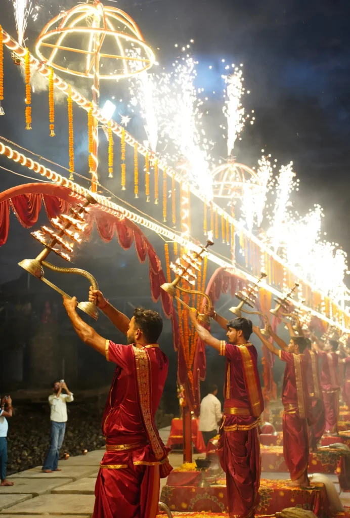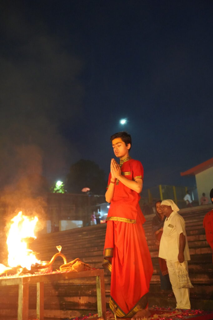 The sacred Ganga Aarti is performed with devotion, lamps, chanting, and Vedic mantras on the holy banks of Maa Ganga.